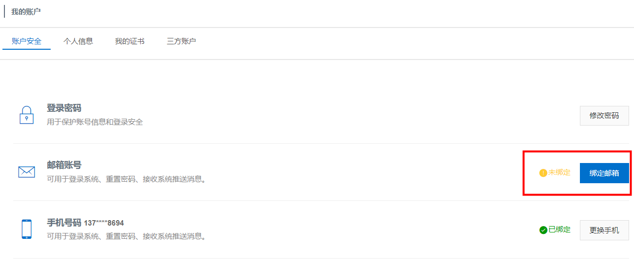 如果还未绑定邮箱,则在 账户安全 页中点击 “绑定邮箱”