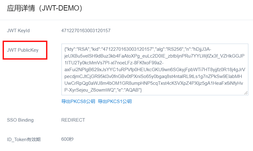 找到 JWT PublicKey,复制粘贴到文本txt,或者使用下方导出,都可以将 JWT PublicKey 导出。将其交给需要接入JWT协议认证的SP业务系统,用作 ID_Token 的验签解析。