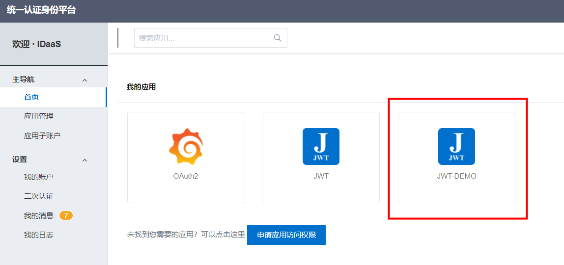 (1)登录IDaaS 平台,点击JWT应用进行单点登录
