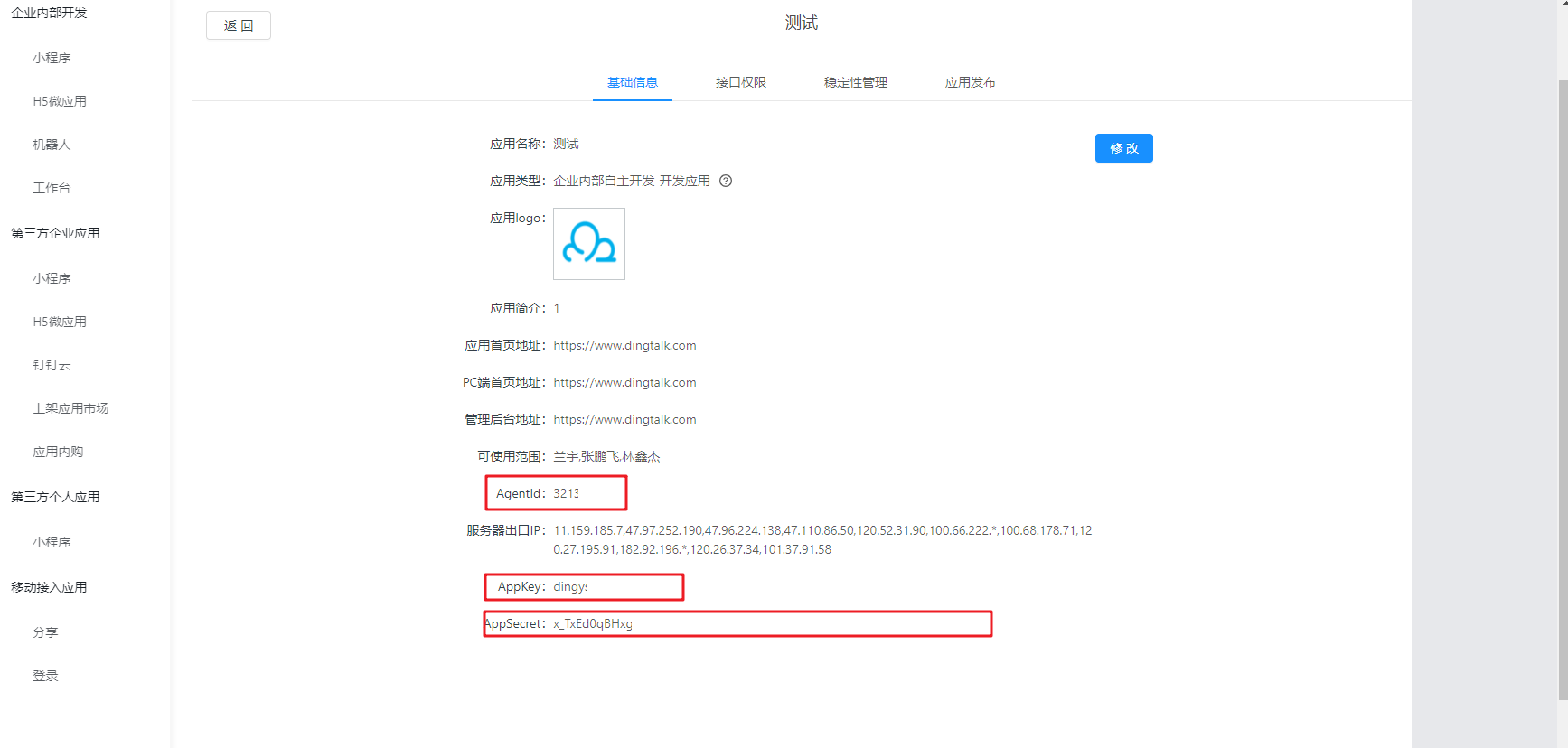 应用appSecret:钉钉微应用的appSecret,获取方式看下面的截图