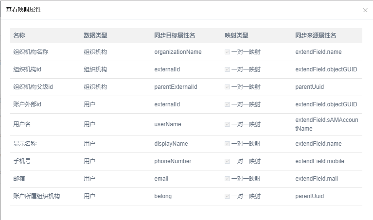 映射属性对应如图,左侧是IDP的字段名,右侧是AD中的字段名。