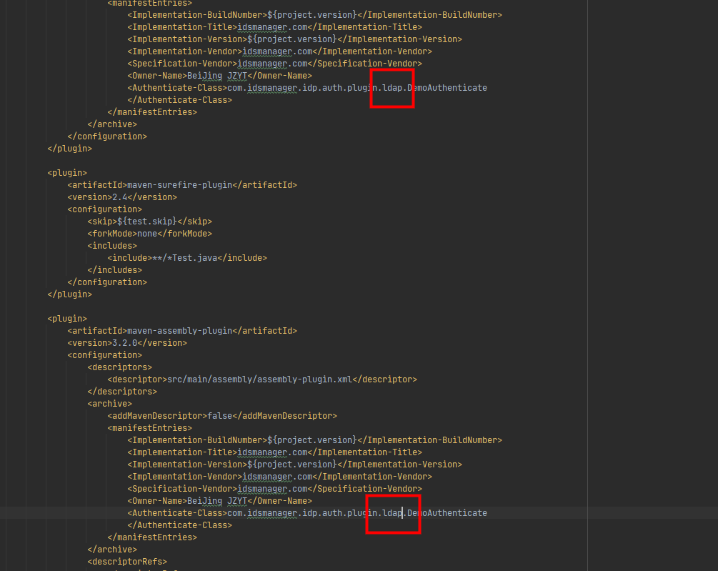 我们需要将 DemoAuthenticate 修改为 LdapAuthenticate,修改后需要到 pom.xml 确认有两处出现了该名字的地方跟着修改到了.